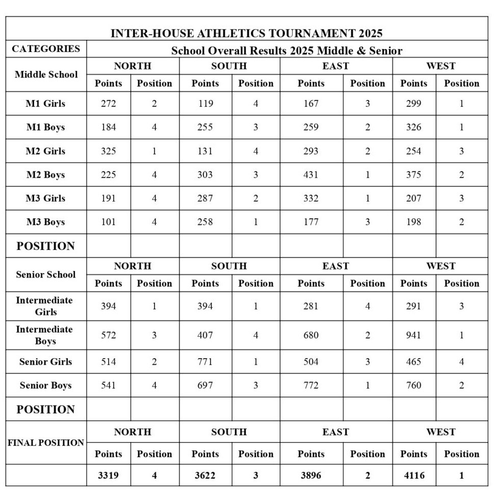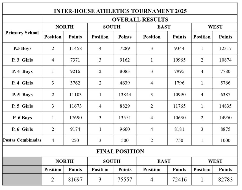 En cuanto a las posiciones, podemos destacar que West fue la House que obtuvo el primer puesto en esta edición 2025, tanto en Primary como en Middle & Senior. ¡Felicitaciones!